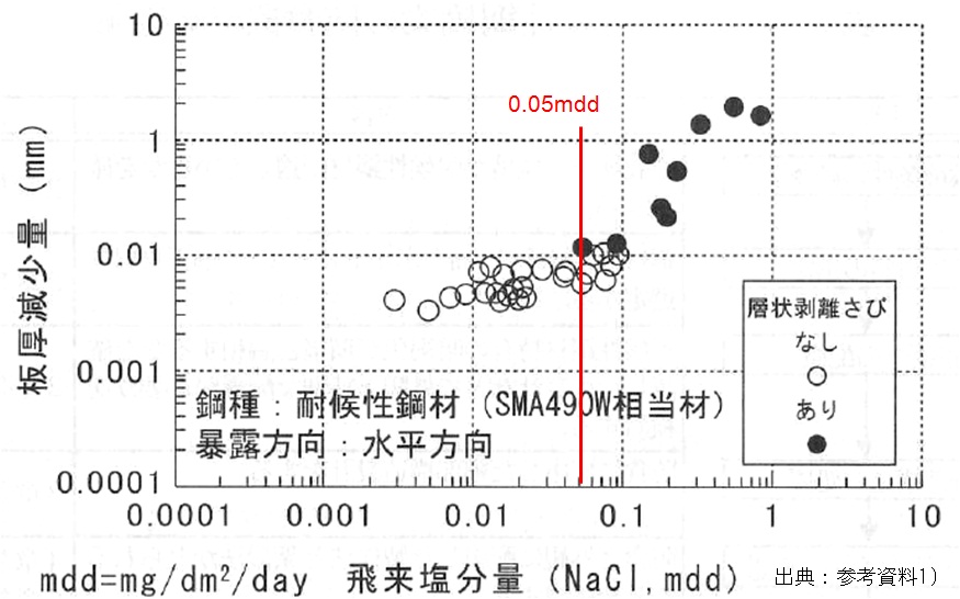 これらの指針があるため,一般的に,飛来塩分量 0.05mdd以下の地域なら裸仕様でもメンテナンスフリーで 60年以上維持できると考えがちである。しかし,これに異議を呈する研究者も少なくない。