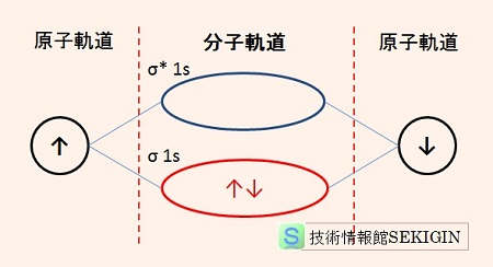 水素分子( H2 )では,結合性分子軌道(σ1s )と反結合性分子軌道(σ* 1s)に分かれ,結合に関与する 2個の電子は,エネルギー順位の低い結合性分子軌道を埋めることができ,分子として安定する。