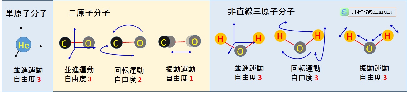 | 分子の種別 | 自由度 (並進) | 自由度 (回転) | 自由度 (振動) | 運動エネルギー |