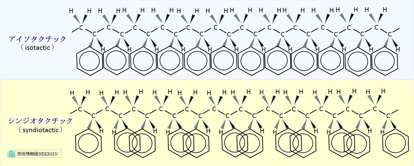 すべての不斉炭素が同じ絶対配置を持つような構造をアイソタクチック( isotactic :イソタクチックともいう)といい,絶対配置が交互に並ぶものをシンジオタクチック( syndiotactic )という。また,ランダムになった構造をアタクチック( atactic )という。