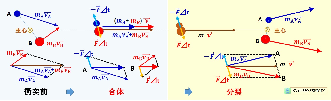 これは,前出の「衝突と反発」の例での衝突時と同様の関係と考えられるので,分裂前の物体の速度νと力積とのベクトル和に従って,それぞれの物質の運動量が得られる。