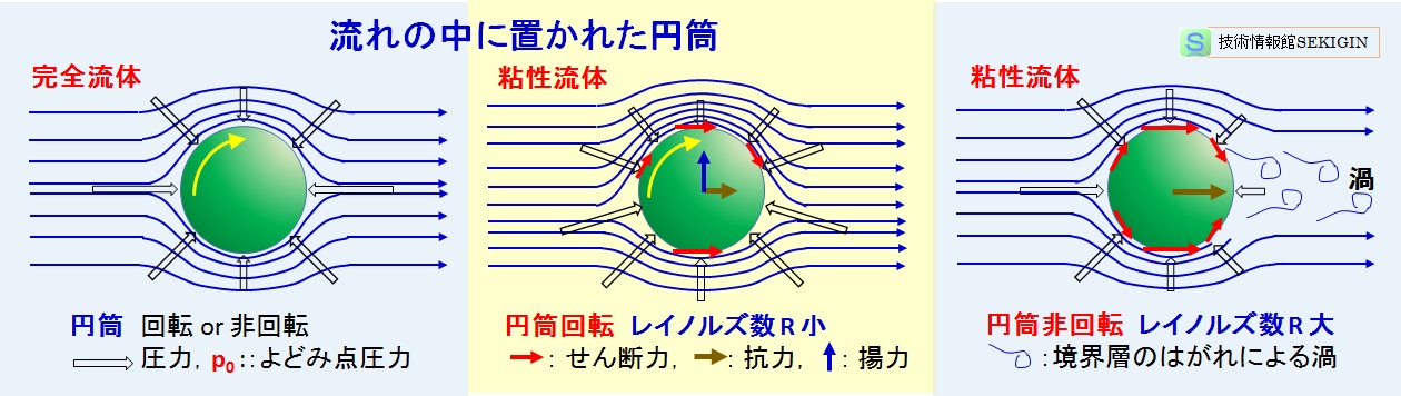 回転する円柱や球の表面に接する流体は,粘性により引きずられ,回転速度と粘性に相応する循環 Γが発生し,移動方向や流に対して垂直方向の力 L(揚力)
