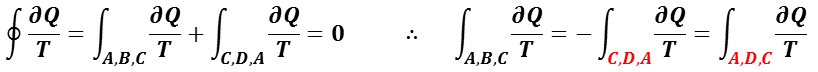 クラウジウスの法則(Clausius theorem)で,可逆過程の全過程(閉じた状態変化のサイクル)は,可逆的な過程の「状態 A →状態 B →状態 C 」と「状態 C →状態 D →状態 A 」に分けることができるので,